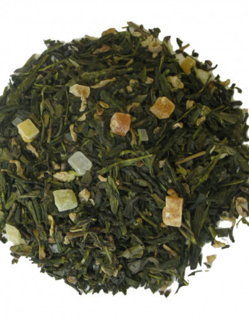 Ingrediënten: Groene thee, kandijsuiker, kokosrasp gekonfijte ananasstukjes ( ananas, suiker, zuurteregelaar: citroenzuur) gekonfijte papajastukjes ( papaja, suiker) natuurlijk aroma, aroma.