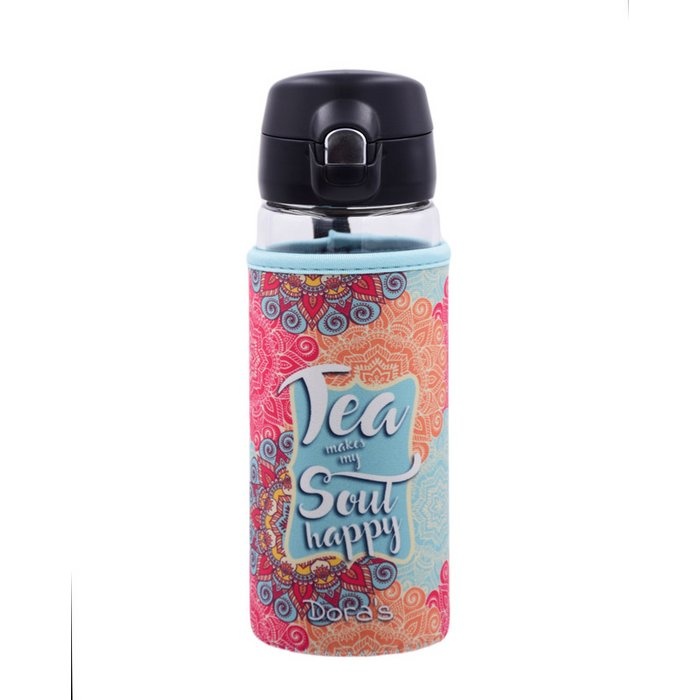 Een glazen drinkbeker van 450 ml met neopreen hoes om de inhoud heerlijk warm te houden. Met uitneembare theezeef en goed afsluitbare drinktuit.