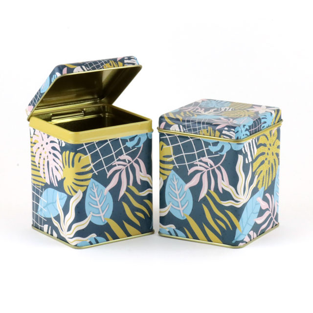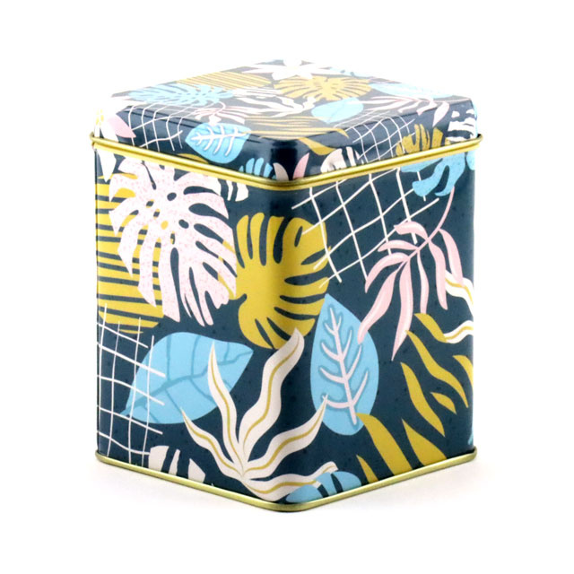 Een kleurig en fleurig theeblikje Tropical van 70x70x90 mm, met een scharnierend deksel om je thee heerlijk vers en geurend te houden.