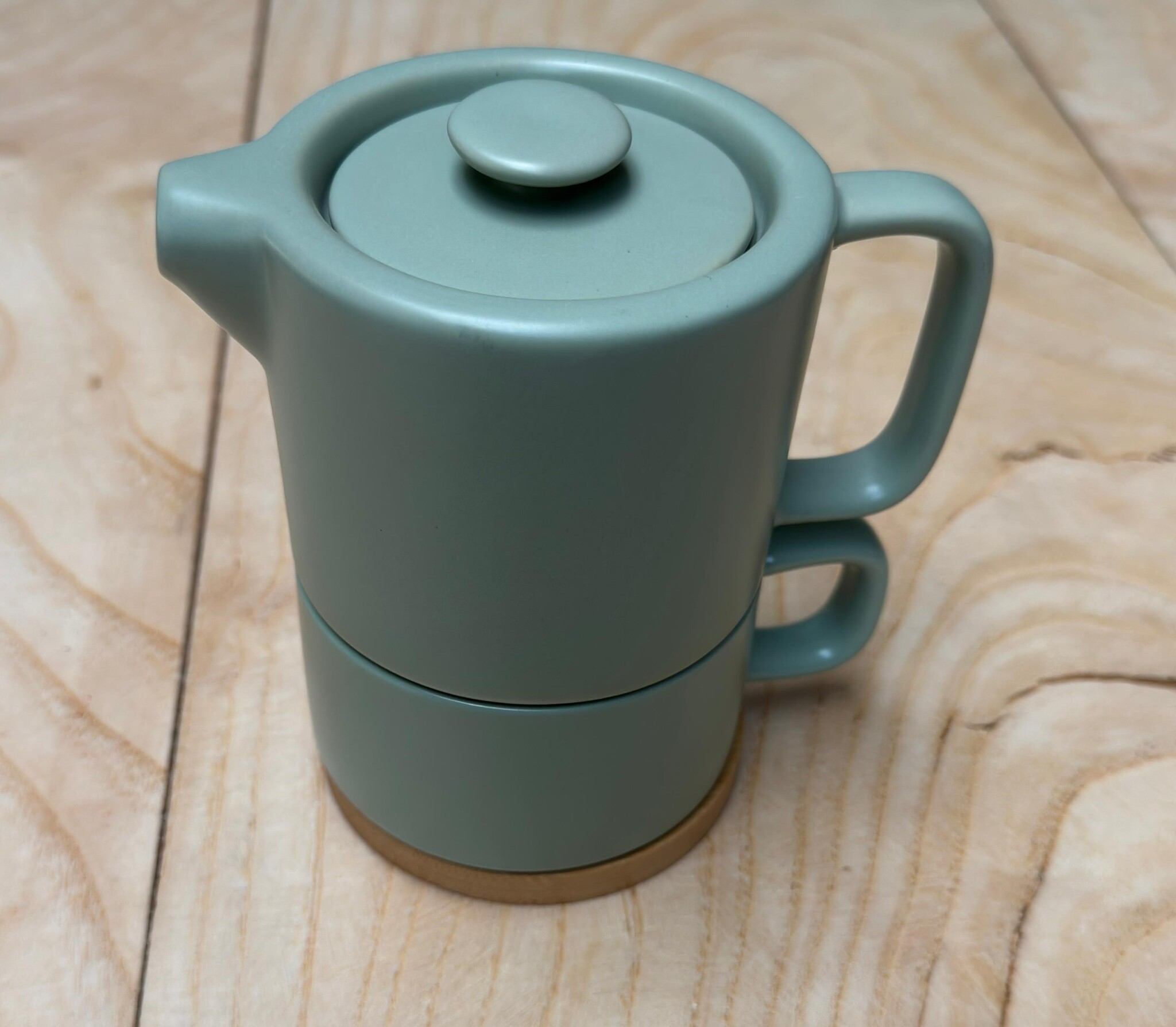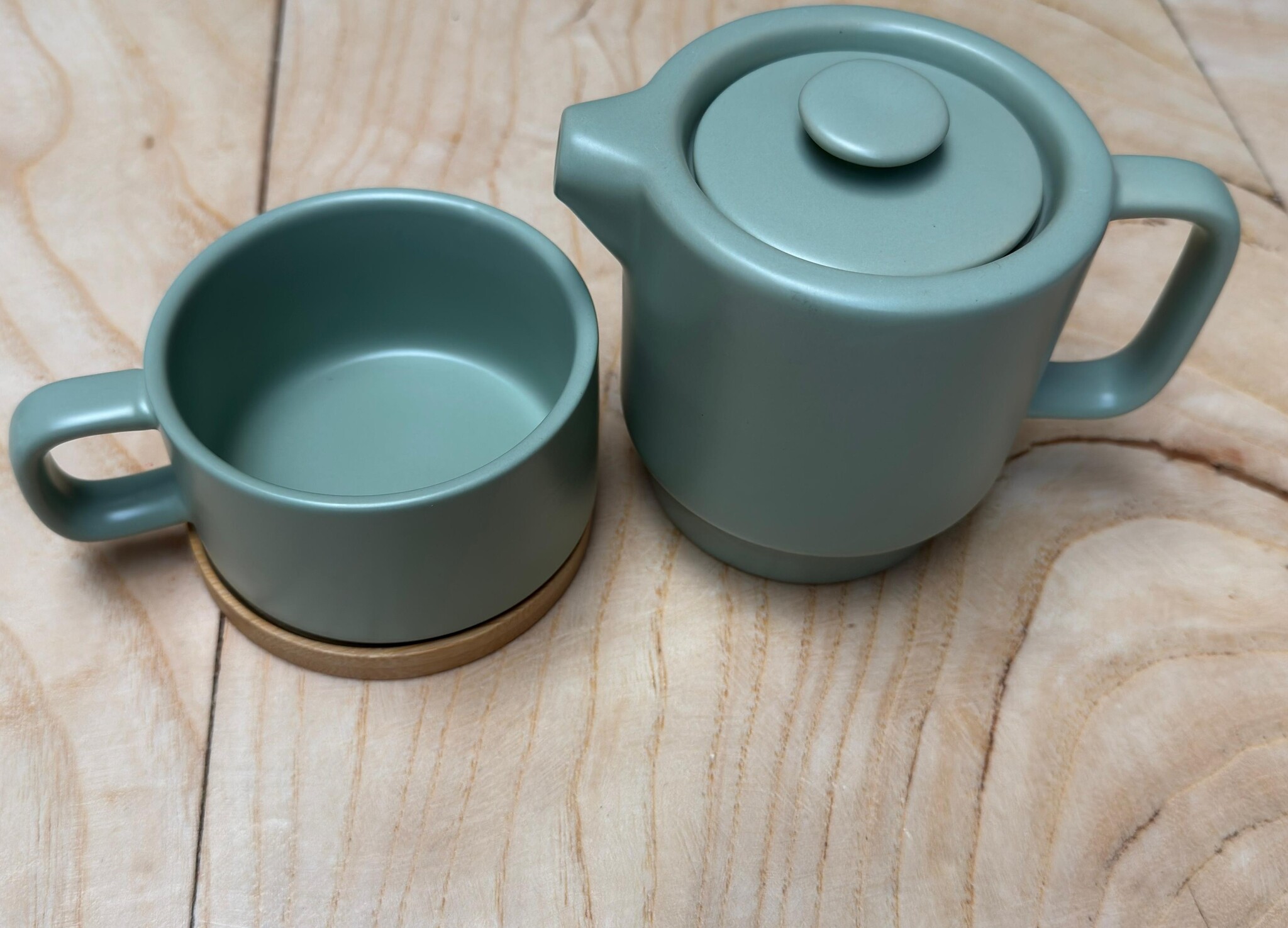 Stijlvolle theepot mintgroen 40cl met deksel en rvs filter, inclusief bijpassend kopje met bamboe onderzetter. Perfect voor één persoon, ideaal voor losse thee en rustmoment met een natuurlijke uitstraling.