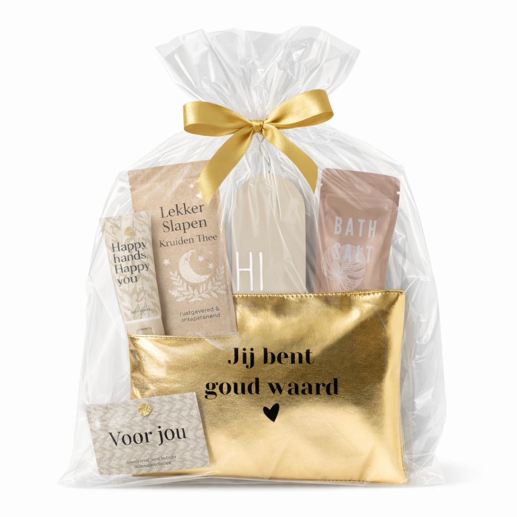 toilettasje jij bent goud waard is een rustgevend cadeau vol zachte geuren en selfcare, perfect om even helemaal tot jezelf te komen.